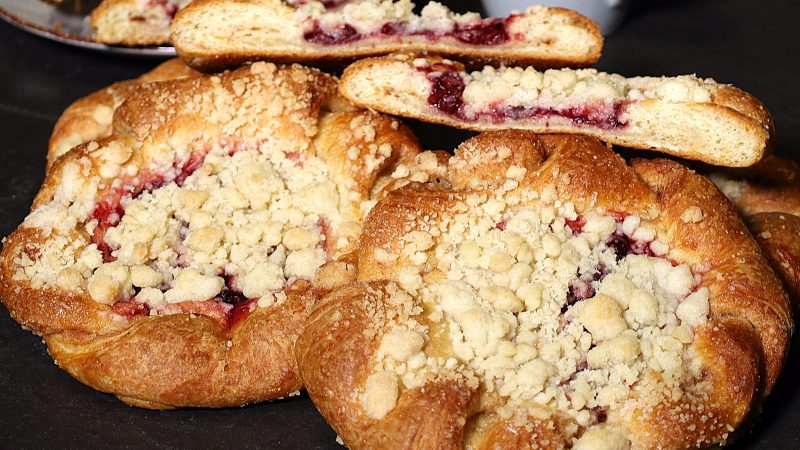 Saftiger Dinkelteig, gefüllt wahlweise mit Kirschen oder Apfel, dazu knusprige Streusel obendrauf. Fruchtig, nicht zu süß und eigentlich fürs Kaffeestück gedacht. In der Praxis wird’s aber oft Frühstück, kleine Nachmittagssünde oder beides. Wir haben gestern selbst getestet – rein aus Qualitätsgründen natürlich. Ergebnis: Man nimmt selten nur eins.